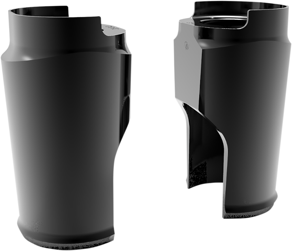 Features notched inside surfaces to allow direct bolt-on fitment of 18” x 5.5” wide/fat front fenders and wheel kits on touring models, Universal design accepts all aftermarket fat/wide front fender kits, Fork boots will work with factory and aftermarket fork legs, CNC-machined from billet aluminum, Check clearances when installing with fat front wheel/fender applications.