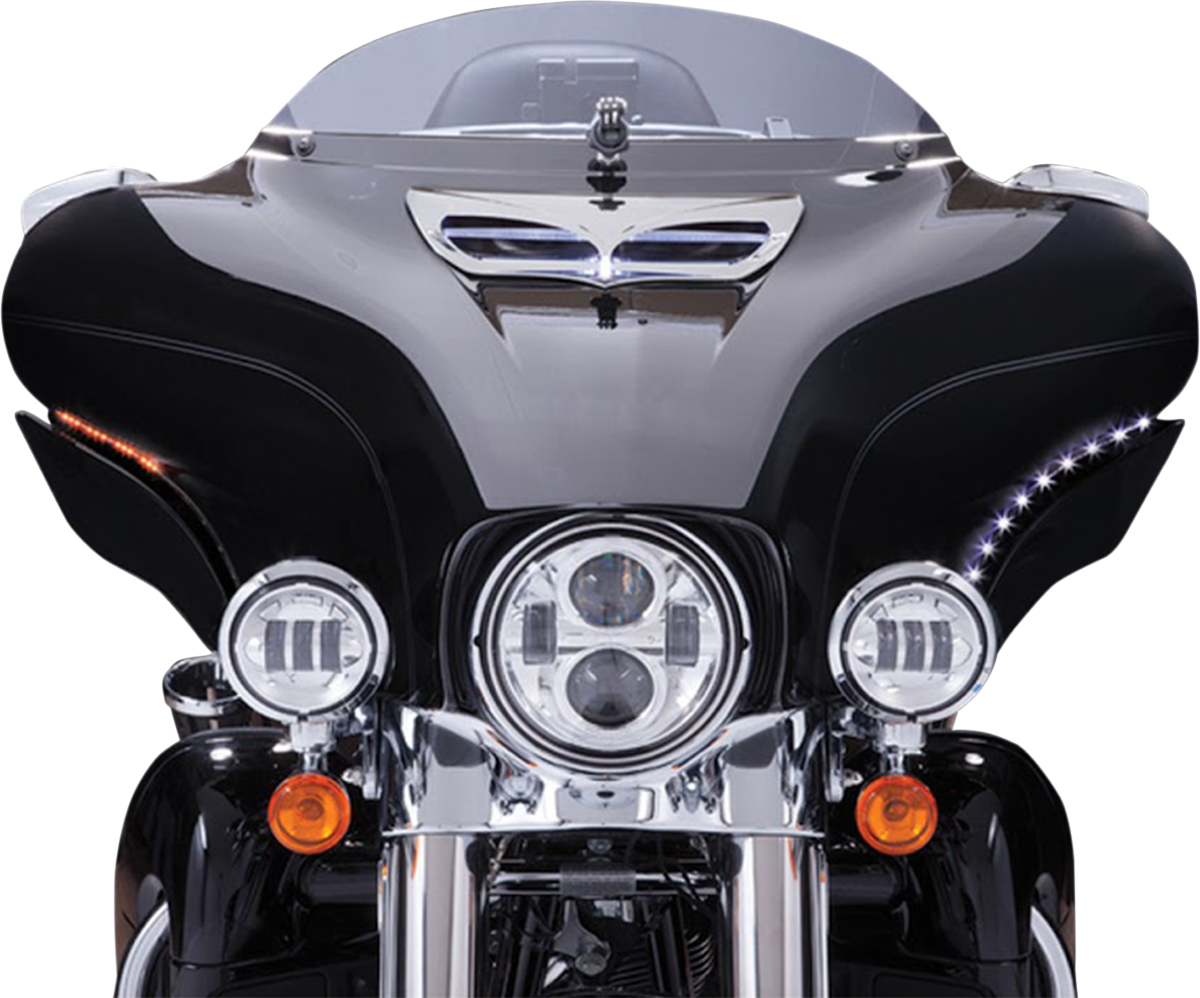 These innovative strips feature ultrabright white LEDs to work as daytime running lights and also amber turn signals on each side, Easy installation using included 3M tape with included wiring adapter that plugs into OEM harness, Low-profile black circuit board blends in seamlessly when the lights are off, White lights fade when turn signals are activated so the amber really stands out, Requires no drilling, cutting, or splicing