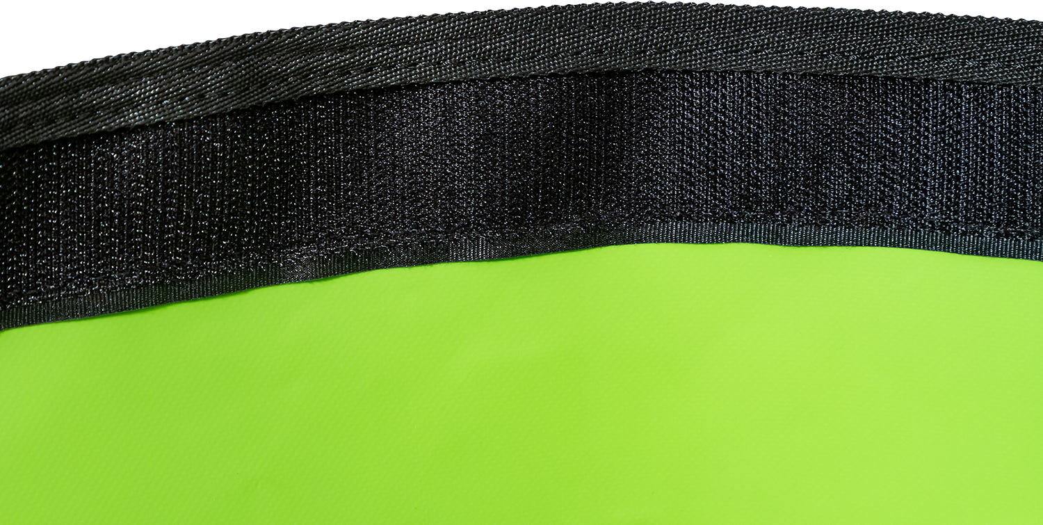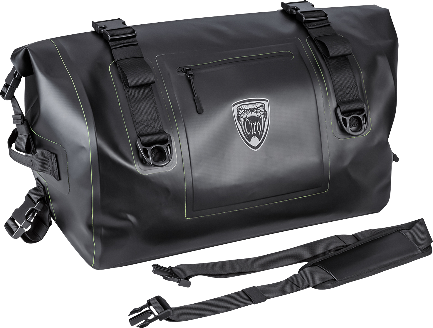 Collapsible, Quick release shoulder strap doubles as tie down strap, Adjustable loops for quick mounting, Custom 840d nylon TPU laminate with welding seams, 4 Heavy-duty nylon attachment points, Front and back pockets, YKK zippers, High strength hook & loop roll top closure, Oversized handles, Reflective Ciro logo