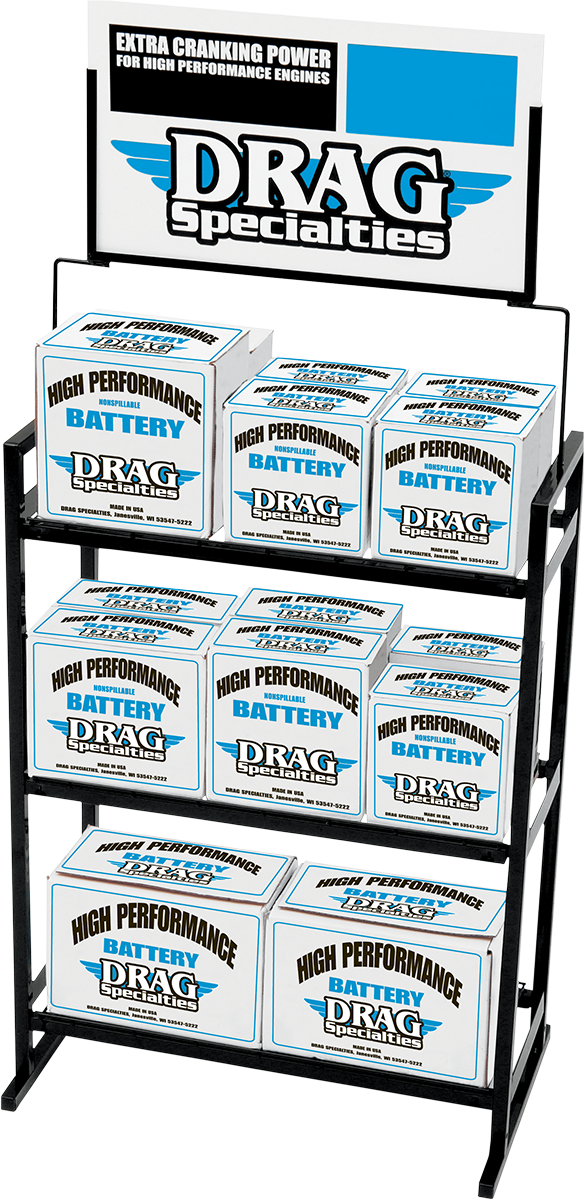 Colorful header card included, Measures 24-1/2” L x 10” W x 47” H, Holds a great selection of Drag Specialties batteries in less than two square feet of floor space, Easily assembled – no tools required, NOTE: Ask your Drag Specialties sales representative how to receive the battery display at no charge.