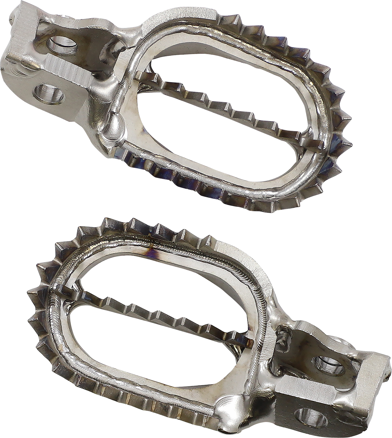 Made from aerospace-grade titanium Grade 5 Ti-6AL-4V with chamber-controlled welding, 57 mm cleated platform provides ample surface area and support for the most aggressive riding, Super lightweight coming in under 300 grams per set, Inner cleated webbing design provides added traction surface and strength to the foot pegs, Beveled front and rear edge, prevents pegs from hanging up in deep ruts