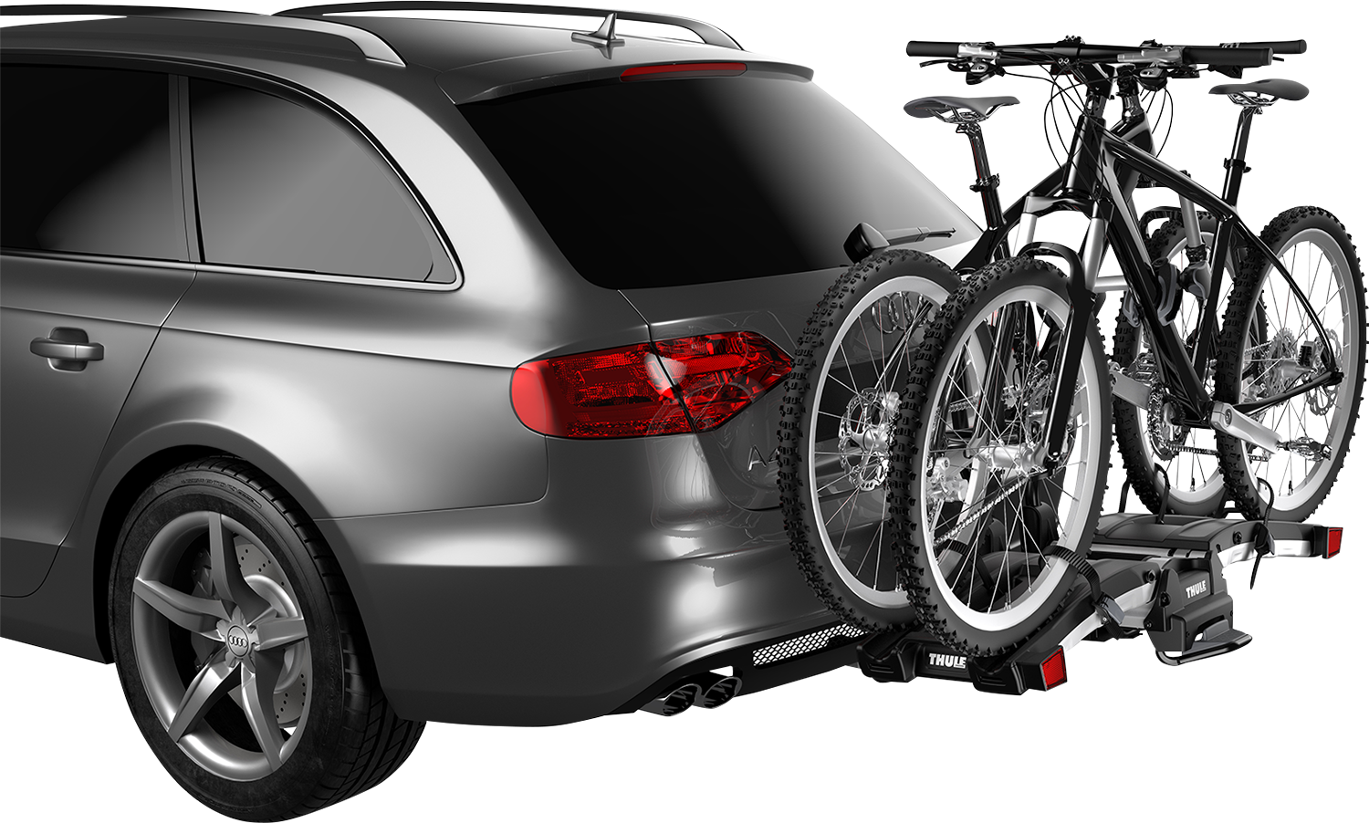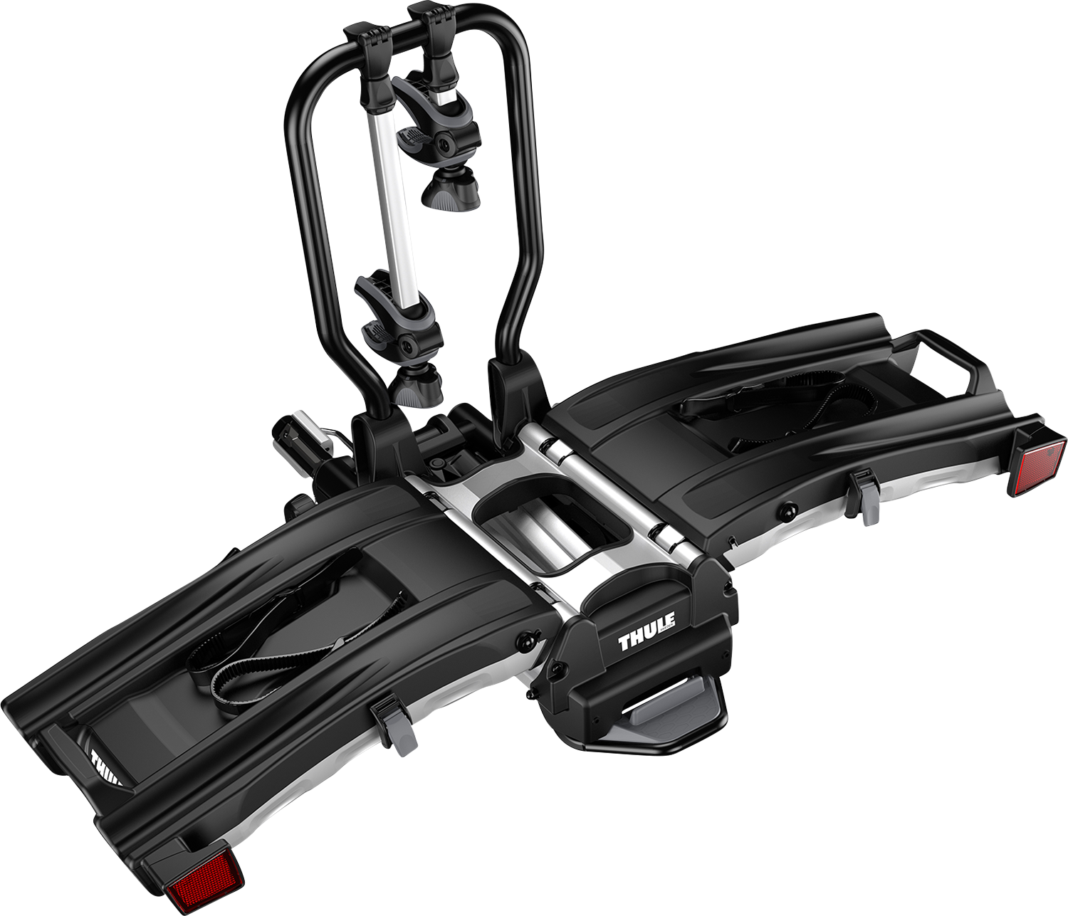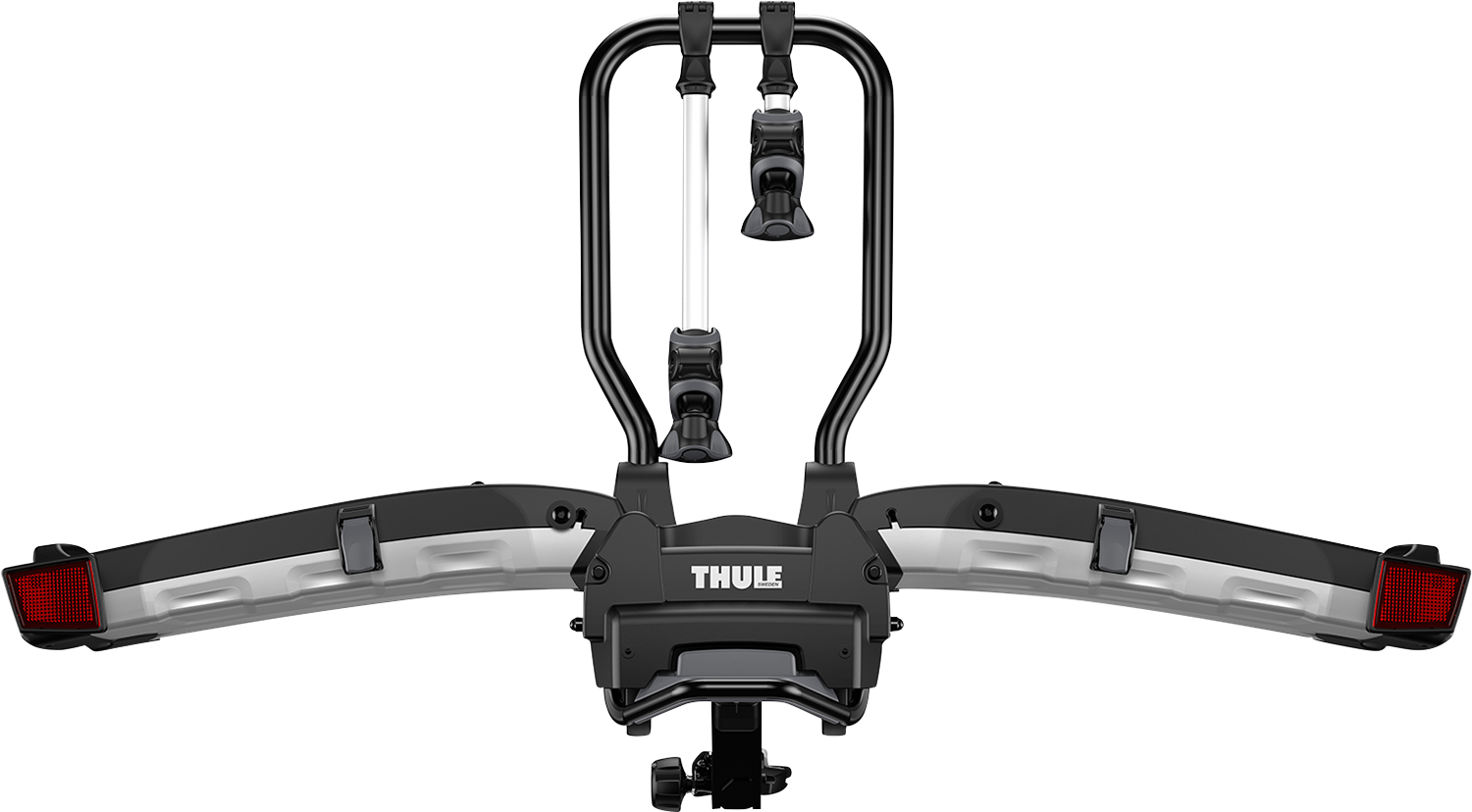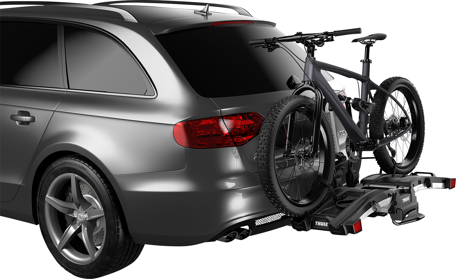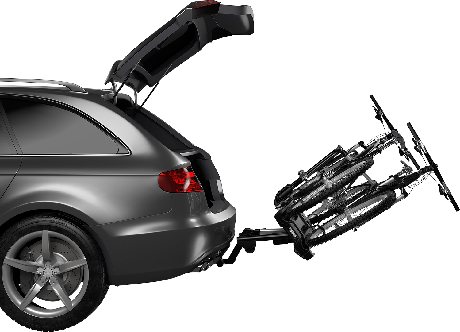 Fully foldable for convenient mounting, handling and storage , High load capacity enabling transport of e-bikes and heavy mountain bikes , Easy trunk access even with bikes mounted, thanks to smart foot pedal tilt , Wheel straps with adjustable pump buckles for fastening wheels, Easy mounting of bikes through detachable bike arms with lockable Thule AcuTight torque limiter knobs that click when optimal torque is reached , Large distance between wheel holders enabling transport of sturdy bikes with large wheel bases , Ergonomic transport of the bike rack thanks to the integrated transport wheels and carrying handle , Foldable bike loading ramp integrates into rack for convenient storage (included) , Lock your bikes to the bike rack and your bike rack to the receiver (locks included), Max load capacity 130 lb max bike weight 65 lb, Dimensions: 48.4" x 25" x 26.7" with a folded dimension of 31" x 12" x 26" with a weight of 45 lb, Max tire width of 3", max wheel size (diameter) of 29" and max wheelbase of 1300 mm, 9" distance between bikes