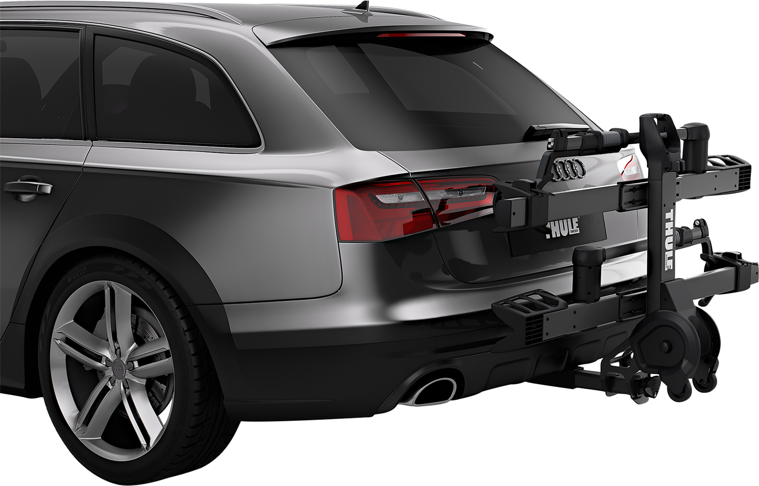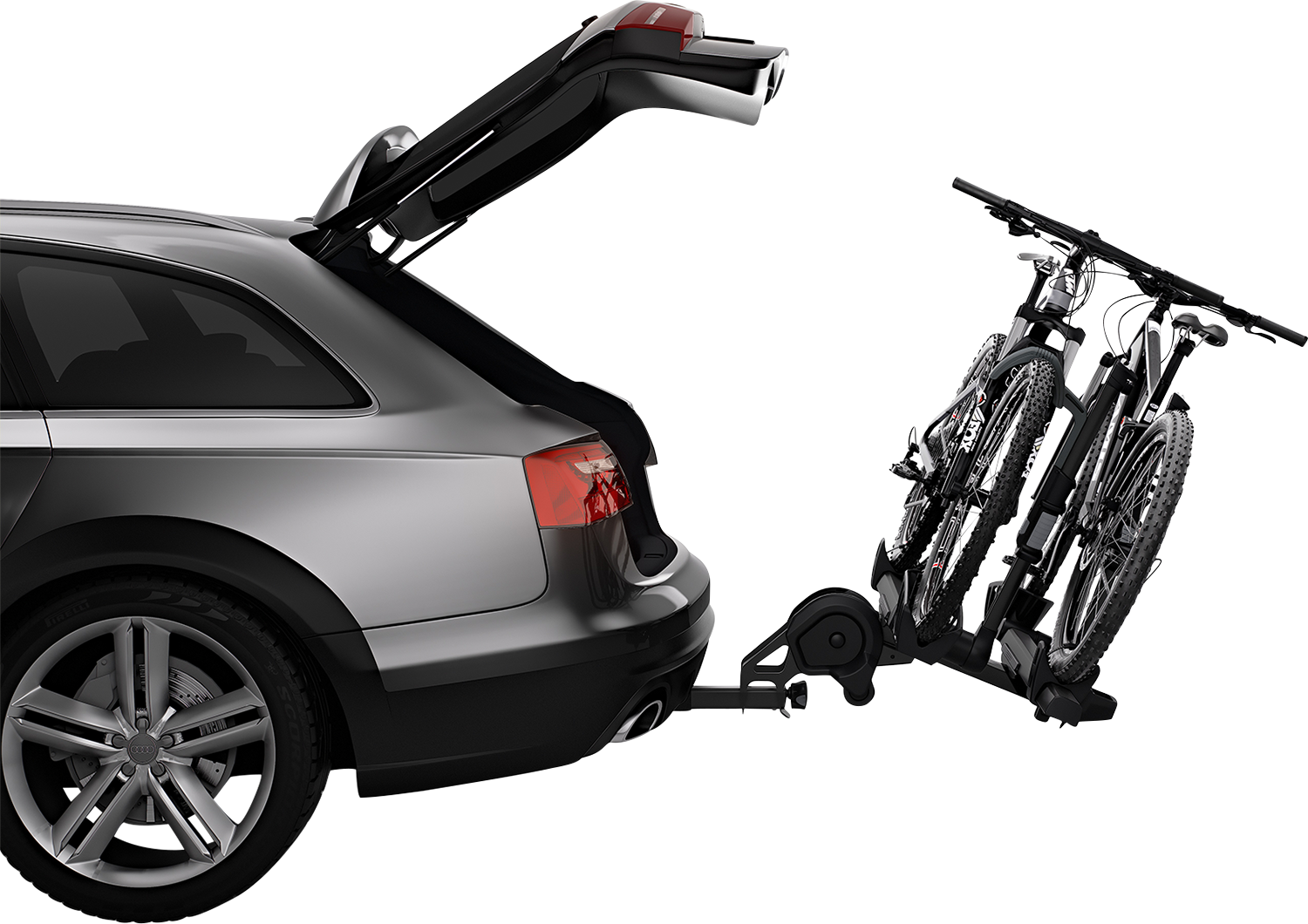 Integrated wheels help transport the rack to and from the vehicle , Tool-free AutoAttach system makes it quick and easy to install and remove the rack , HitchSwitch lever tilts up when not in use or tilts down for rear vehicle access without removing the rack , Integrated cable lock and lock knobs lock bikes to the rack and the rack to the receiver hitch , No frame contact , Versatile design fits nearly all bikes, including e-bikes up to 60 lbs , Adjustable spacing allows you to mount two bikes without interference , Fits 20” to 29” wheels and up to 5” tires, ideal for road, mountain, fat-tire, and e-bikes , Fits 2" Receivers, Load capacity of 120 lb with a max bike weight of 60 lb, 54" x 43" x 15" with a folded dimension of 54.7" x 22.5" x 33.8"